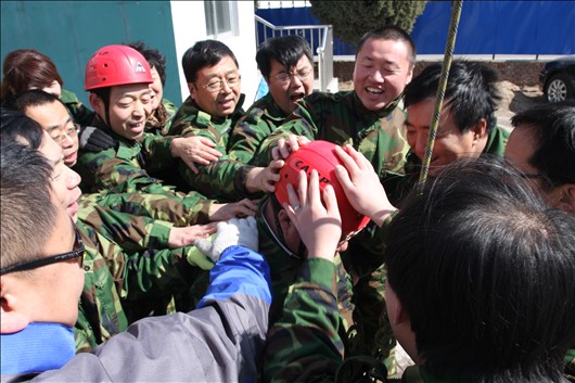 最后一個(gè)項(xiàng)目是海灘逃生,在4米高的墻面前六個(gè)小團(tuán)隊(duì)合并成一個(gè)大團(tuán)隊(duì),競(jìng)爭(zhēng)沒(méi)有了,只剩下合作,我們?cè)诤芏痰臅r(shí)間內(nèi)找到了逃生的方法,高個(gè)隊(duì)員站在魁悟高大的墊底隊(duì)員肩上,再把下一位隊(duì)員拉上來(lái),其余隊(duì)員圍在墻下,雙臂彎曲呈托舉狀,做保護(hù)人墻,最后一個(gè)隊(duì)員抱緊倒下來(lái)第二個(gè)隊(duì)員的雙腿,被墻上的隊(duì)員拉上來(lái)了,84名隊(duì)員只用了20多分鐘,全部隊(duì)員逃生。我們這些中間先逃生的隊(duì)員,看著墊底隊(duì)員因被踩而紅紅的肩膀,衷心感謝他們的付出和犧牲,看著先驅(qū)隊(duì)員拉人而酸痛的胳膊,感謝他們的勇氣和力量,互相擁抱感謝著,為了給予別人的支持,為了團(tuán)隊(duì)合作的成功,為了相互的信任,為了超越了的自己,最后的感受,團(tuán)隊(duì)精神。