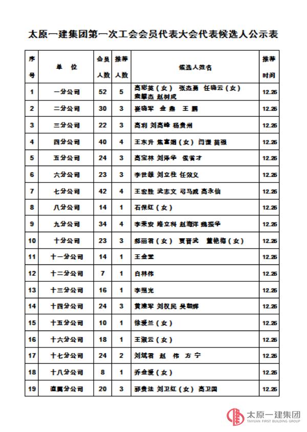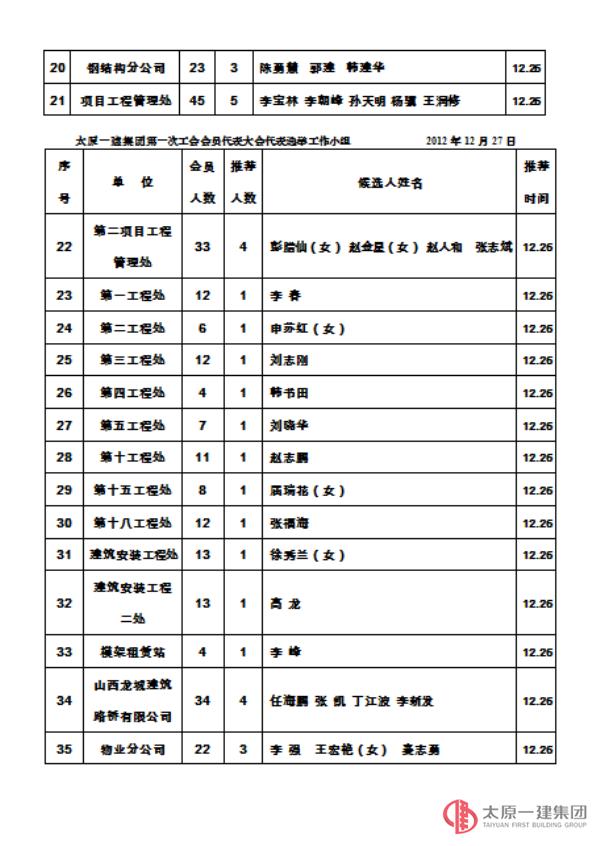 12月20日,集團(tuán)公司召開(kāi)了一屆二次職代會(huì)和第一次工會(huì)會(huì)員代表大會(huì)籌備工作會(huì)議。會(huì)上對(duì)一屆二次職代會(huì)和第一次工會(huì)會(huì)員代表大會(huì)的籌備工作進(jìn)行了安排部署。會(huì)上,通過(guò)了第一次工會(huì)會(huì)員代表大會(huì)代表選舉辦法,對(duì)第一階段的選舉工作進(jìn)行了布置,截止12月26日,各單位代表推薦工作按期完成,應(yīng)推薦代表候選人96名,實(shí)際推薦代表候選人96名。經(jīng)代表選舉工作小組根據(jù)有關(guān)規(guī)定對(duì)候選人資格審查,推薦的代表候選人資格全部有效,現(xiàn)對(duì)第一批85名候選人名單進(jìn)行公示,公示期3天,28日至30日。如對(duì)代表候選人資格有異議,可以通過(guò)以下聯(lián)系方式向選舉工作小組反映,我們將按照有關(guān)規(guī)定辦理。