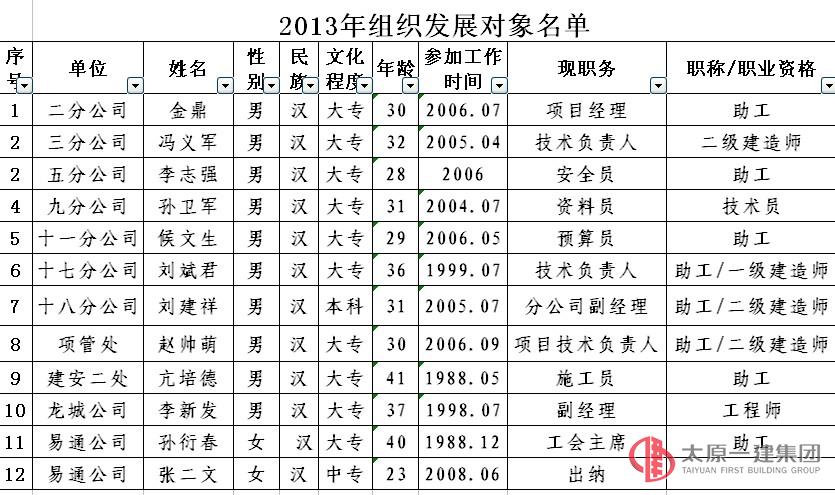 經(jīng)基層支部研究,黨委組織部門考察,擬定以下12名同志為2013年組織發(fā)展對(duì)象,現(xiàn)公示如下:請(qǐng)廣大黨員和職工群眾監(jiān)督,對(duì)以下發(fā)展對(duì)象如有疑義,請(qǐng)向黨群工作部反映。