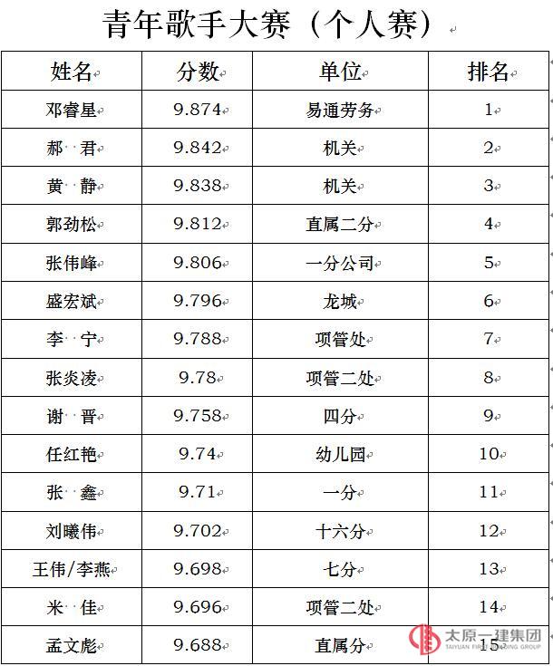 12月12、13兩日,由黨群工作部、人力資源部承辦的集團(tuán)公司第一屆“精營杯”青年職工才藝大賽初賽在公司四樓會(huì)議室成功舉行。預(yù)賽氣氛熱烈,觀眾熱情。來自機(jī)關(guān)與基層25個(gè)單位200余名選手以個(gè)人和團(tuán)體的形式為大家呈現(xiàn)了一場(chǎng)場(chǎng)精彩的演出,選手們高唱祖國高唱黨,高唱企業(yè)高唱美好生活,展現(xiàn)出了無限的青春活力,博得了一陣陣熱烈的掌聲和歡呼聲。本次初賽的前15名個(gè)人選手、前6名團(tuán)體晉級(jí)決賽。(附表)