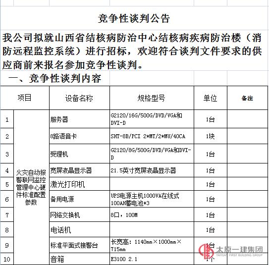 我公司擬就山西省結(jié)核病防治中心結(jié)核病疾病防治樓(消防遠(yuǎn)程監(jiān)控系統(tǒng))進(jìn)行招標(biāo),歡迎符合談判文件要求的供應(yīng)商前來報(bào)名參加競爭性談判。