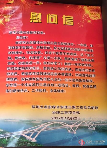 12月29日汾河太原段綜合治理第三期工程指揮部為六分公司承建的汾河段綜合治理第三期工程五標(biāo)段項目部送來慰問信和表揚(yáng)信,感謝項目部在項目經(jīng)理陳宏的帶領(lǐng)下,全體項目管理人員齊心協(xié)力,不懼嚴(yán)寒,科學(xué)組織,搶工期、保安全、保質(zhì)量、實(shí)現(xiàn)暗涵首家全線貫通,為其他標(biāo)段樹立了榜樣。下一步,爭取成為汾河太原段綜合治理第三期工程第一個完成的標(biāo)段,為確保青運(yùn)會重點(diǎn)工程做出積極貢獻(xiàn)。