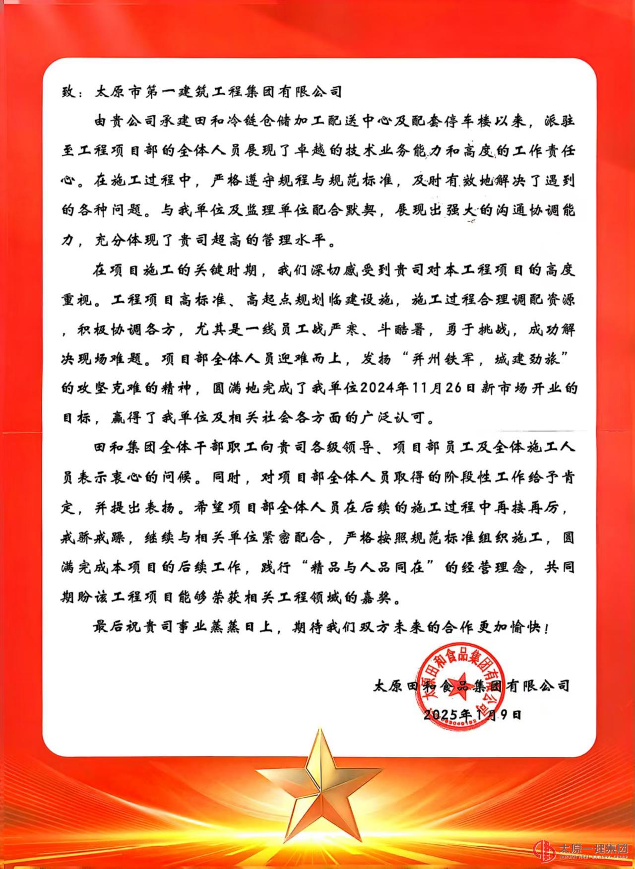 2025年1月9日,太原田和食品集團(tuán)有限公司董事長(zhǎng)劉浩明一行六人蒞臨太原一建集團(tuán),并向太原一建集團(tuán)送來表?yè)P(yáng)信。