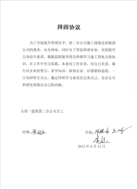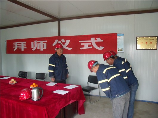 2012年4月11日上午,二分公司在太原濱河西路南延冶峪雨水泵站項(xiàng)目部舉行了張曉東、李峻、王鵬三位同志拜李國寶為師傅,學(xué)習(xí)做人做事及現(xiàn)場管理各方面知識的拜師儀式,三位徒弟現(xiàn)場行拜師禮,向師傅遞交了拜師協(xié)議。此項(xiàng)活動是為了達(dá)到集團(tuán)公司提出的全面發(fā)展,提高現(xiàn)場管理水平的要求,緊密結(jié)合分公司實(shí)際,培養(yǎng)青年人學(xué)技術(shù)、做好人、尊師學(xué)藝的風(fēng)氣,營造和諧發(fā)展,盡快成才,為企業(yè)盡快培養(yǎng)青年人學(xué)好技術(shù)而舉行的。儀式由副經(jīng)理劉海飛主持,分公司經(jīng)理孫慶福講話,項(xiàng)目部全體管理人員參加。