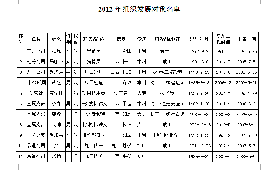 根據(jù)發(fā)展黨員“堅持標準、保證質(zhì)量、改善結(jié)構(gòu)、慎重發(fā)展”的工作 方針和黨委“一看信念、二看貢獻、三看口碑”的組織發(fā)展原則,經(jīng)基層黨支部和公司黨群工作部兩級考察,擬吸收二分公司張琨等11名同志為中共預備黨員,并在近期提交所在支部黨員大會討論。為保證組織發(fā)展質(zhì)量, 現(xiàn)將11名發(fā)展對象的基本情況公示如下,接受廣大黨內(nèi)外群眾監(jiān)督。