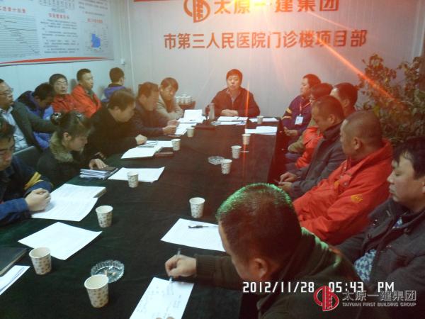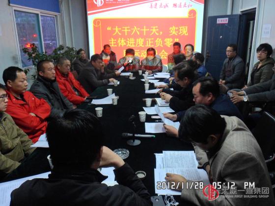 11月28日下午16:30,直屬分公司在太原市第三人民醫(yī)院門(mén)診樓項(xiàng)目部召開(kāi)了“大干六十天,實(shí)現(xiàn)主體進(jìn)度正負(fù)零”的生產(chǎn)動(dòng)員活動(dòng)。直屬分公司經(jīng)理郭貴法、副經(jīng)理趙云江、副經(jīng)理蔡志峰等領(lǐng)導(dǎo),施工現(xiàn)場(chǎng)項(xiàng)目負(fù)責(zé)人毛振武,鋼筋外加工配送中心經(jīng)理郭瑞彪,山西恒臺(tái)建業(yè)發(fā)展有限銷(xiāo)售公司以總經(jīng)理張永龍帶隊(duì)一行7人,太原市宏興海貿(mào)易有限公司經(jīng)理王海衛(wèi)以及項(xiàng)目部全體管理人員參加了本次會(huì)議。本次會(huì)議由該項(xiàng)目副經(jīng)理霍建主持。會(huì)議內(nèi)容有:1、項(xiàng)目經(jīng)理姬德銀做“大干六十天,實(shí)現(xiàn)主體進(jìn)度正負(fù)零”為題的生產(chǎn)動(dòng)員報(bào)告,報(bào)告以冬季施工為背景,從人、材、機(jī)、物等方面提出具體保障措施,加強(qiáng)“四科一室”項(xiàng)目管理對(duì)施工生產(chǎn)的快捷服務(wù),來(lái)保證實(shí)現(xiàn)預(yù)期工期目標(biāo)。2、各科室負(fù)責(zé)人、材料供應(yīng)商一一做承諾表態(tài)。3、分公司副經(jīng)理助理趙云江、常務(wù)副經(jīng)理蔡志峰代表分公司對(duì)直屬302項(xiàng)目部管理團(tuán)隊(duì)進(jìn)行肯定,并表示希望大家不要辜負(fù)分公司的信任,不流于形式,強(qiáng)抓落實(shí),保證冬施的順利進(jìn)展。4、分公司經(jīng)理郭貴法高度評(píng)價(jià)本次會(huì)議的召開(kāi),詳細(xì)的分析當(dāng)前形勢(shì),并指出:要抓好活動(dòng)期間的項(xiàng)目管理及各項(xiàng)措施的落實(shí)情況。要求大家要相互信任,指出“人在一起不是團(tuán)隊(duì),心在一起才是團(tuán)隊(duì),要樹(shù)立統(tǒng)一的價(jià)值觀”。及時(shí)發(fā)現(xiàn)問(wèn)題,努力解決問(wèn)題,爭(zhēng)當(dāng)先進(jìn)。同時(shí),希望各供應(yīng)商積極響應(yīng)項(xiàng)目部的號(hào)召,保證各項(xiàng)物資按期、按量、按標(biāo)準(zhǔn)提供,保證在此施工期間的物質(zhì)需求。最后,郭經(jīng)理要求項(xiàng)目部各管理崗位分工協(xié)作,心往一處想,有勁一處使,克服嚴(yán)冬,同心協(xié)力,狠抓落實(shí),保證“實(shí)現(xiàn)主體進(jìn)度正負(fù)零”的進(jìn)度目標(biāo)順利完成,為門(mén)診樓工程按期完工打響“第一槍”,為直屬分公司承建太原市人民醫(yī)院后續(xù)工程樹(shù)立良好企業(yè)形象。