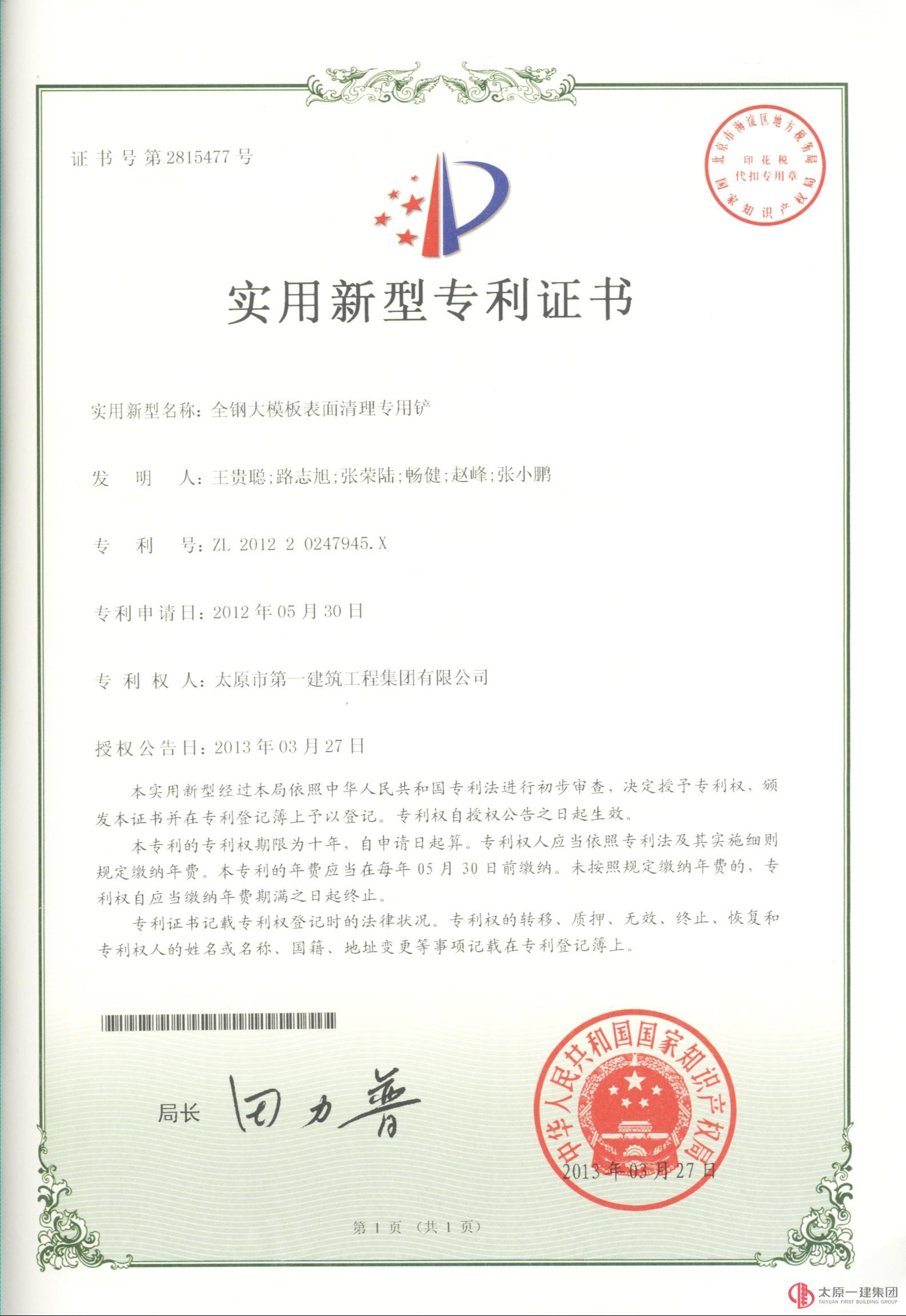 集團(tuán)公司于2013年3月27日又取得了國(guó)家知識(shí)產(chǎn)權(quán)局頒發(fā)的2項(xiàng)實(shí)用型新型專(zhuān)利證書(shū):⑴樓梯踏步陽(yáng)角保護(hù)構(gòu)件(專(zhuān)利號(hào):ZL 2012 2 0247932.2);⑵全鋼大模板表面清理專(zhuān)用鏟(專(zhuān)利號(hào):ZL 2012 2 0247945.X)。該2項(xiàng)專(zhuān)利是集團(tuán)公司繼2013年1月30日取得5項(xiàng)實(shí)用型新型專(zhuān)利證書(shū)后的又一專(zhuān)利成果。至此,集團(tuán)公司在專(zhuān)利成果方面,共取得了7項(xiàng)國(guó)家級(jí)實(shí)用型新型專(zhuān)利證書(shū)。