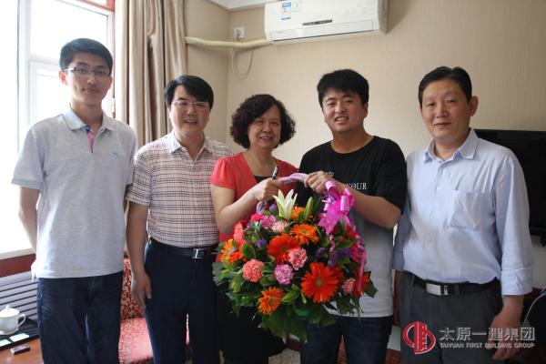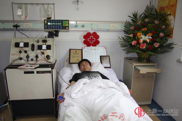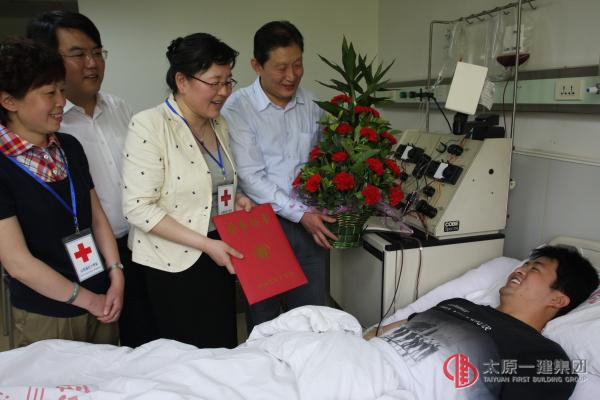 5月12日,在志愿捐獻(xiàn)造血干細(xì)胞的前一天,集團(tuán)公司領(lǐng)導(dǎo)一同去看望陳宏。(左一為省紅十字會(huì)專派照顧陳宏起居的工作人員)