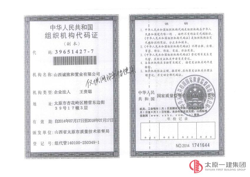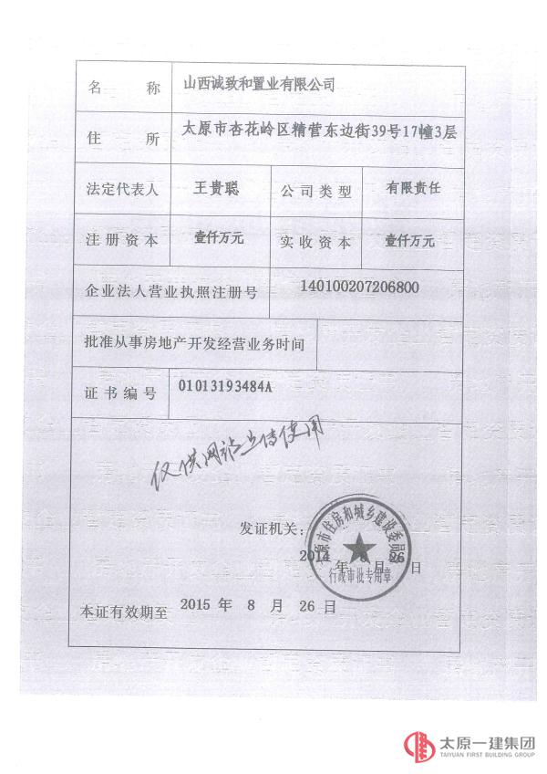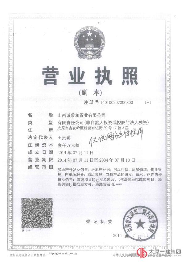 集團(tuán)公司投資的子公司山西誠(chéng)致和置業(yè)有限公司已于2014年8月26日正式成立。公司營(yíng)業(yè)執(zhí)照、資質(zhì)證、稅務(wù)登記證、組織機(jī)構(gòu)代碼證都已申領(lǐng)完畢,營(yíng)業(yè)范圍包括房地產(chǎn)開發(fā)及銷售;房地產(chǎn)經(jīng)紀(jì);房屋租賃;房屋修繕;物業(yè)管理;停車場(chǎng)服務(wù);酒店管理;農(nóng)牧產(chǎn)品的研發(fā);苗木、花卉的種植及銷售;旅游項(xiàng)目的開發(fā)及經(jīng)營(yíng)。各基層單位若有經(jīng)營(yíng)業(yè)務(wù)可與集團(tuán)公司聯(lián)系。
