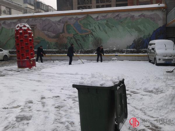 羊年正月初九,一場大雪將太原裝扮的格外美麗。人們還處在春節(jié)的氛圍,職工還處在放假之中,初十早晨八點半,副總經理李偉、行政保衛(wèi)部部長米凱毅、副部長楊金生、總經理辦主任任秀山、副主任趙哲及沈永梅和經警柳繼云、姚綱、孫紅生、保潔人員劉存云、李永革等同志將機關大院的積雪全部清掃干凈,他們這種愛崗敬業(yè),值得全體職工學習。