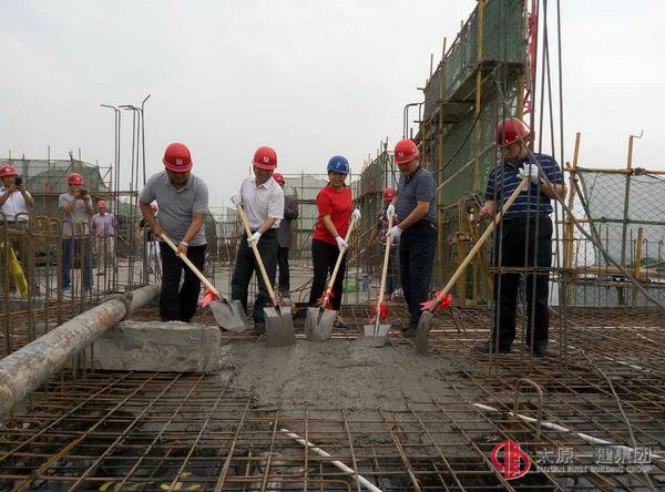 當(dāng)天早上,煙雨蒙蒙,9:38分,吉時(shí)將近,天空瞬息煙斂雨消,主體之巔,雨后一片清新,彩旗與飄帶在風(fēng)中疾舞飛揚(yáng)、獵獵作響,共迎嘉賓。各方領(lǐng)導(dǎo)以及代表,手執(zhí)金鏟將混凝土注入主體之頂,伴隨著七彩禮炮聲聲鳴響。至此,這座歷時(shí)一年零一個(gè)月,凝聚了所有七分公司員工智慧與汗水的大樓主體圓滿封頂。項(xiàng)目經(jīng)理王福帶領(lǐng)全體員工共同焚香祈福,祝在接下來的建設(shè)中一帆風(fēng)順、吉祥如意,同時(shí)祝福集團(tuán)發(fā)展節(jié)節(jié)高升,更上一層樓。