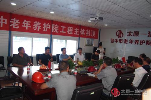 2015年8月3日,第二項(xiàng)目工程管理處承建的“晉中市老年養(yǎng)護(hù)院項(xiàng)目”主體結(jié)構(gòu)順利封頂。參加封頂儀式的有:晉中市民政局局長李建平、晉中市建設(shè)局代建辦主任杜毓格、代建單位晉中市建筑勘察設(shè)計(jì)院院長高曉東、山西新盛建設(shè)監(jiān)理有限公司總監(jiān)理工程師楊秋收、太原市第一建筑工程集團(tuán)有限公司董事長王貴聰和集團(tuán)公司常務(wù)副總經(jīng)理張歧泰、集團(tuán)公司董事王斌、副總經(jīng)理李偉、總經(jīng)理助理陳斌及項(xiàng)目部全體成員。