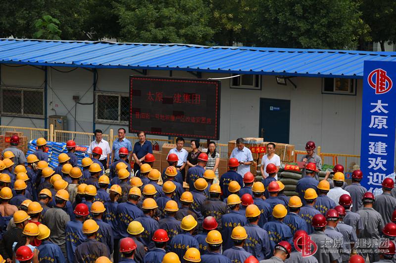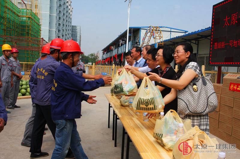 炎炎夏日,驕陽似火。7月27日上午,太原市總工會副主席郎學軍、組織部部長張玲玉、太原市入并建筑企業(yè)工會聯(lián)合會主席陳敏等上級工會領導,帶著西瓜、毛巾、綠豆、礦泉水等慰問品,來到集團公司承建的晉陽街片區(qū)改造安置住房項目進行“夏季送清涼”慰問。集團公司領導王貴聰、張岐泰、李偉、李瑞琪參加了活動。