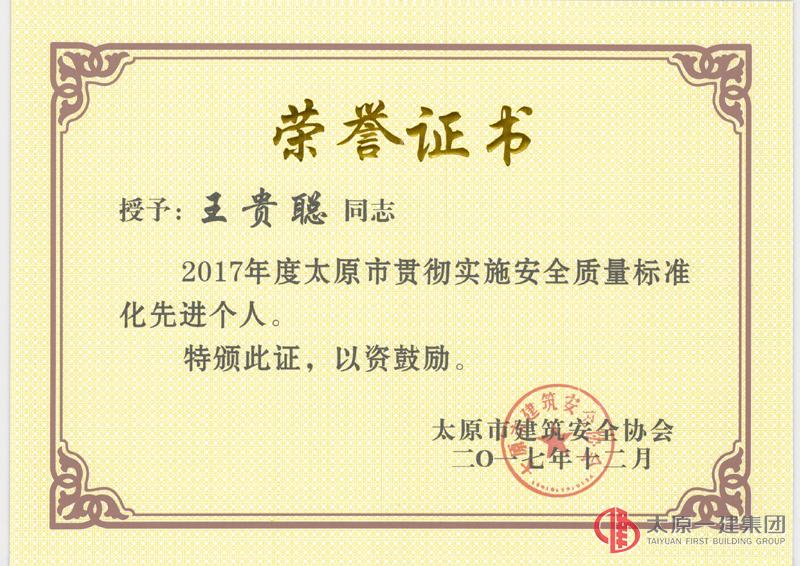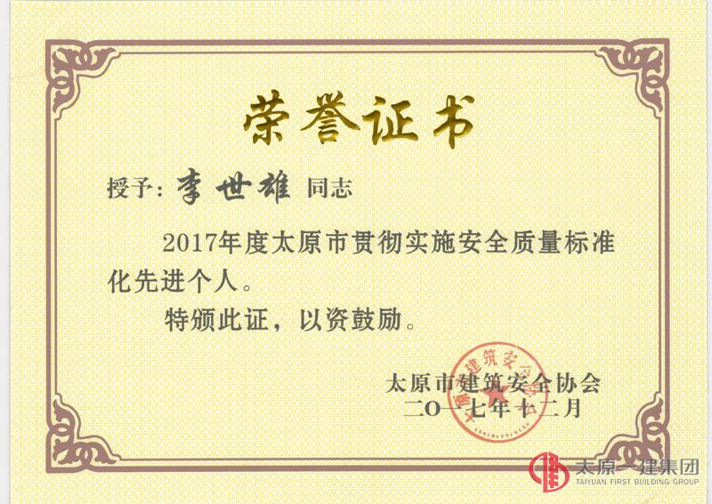 12月29日上午,太原市建筑安全協(xié)會(huì)在三橋大廈組織召開(kāi)“太原市建筑安全協(xié)會(huì)2017年度工作總結(jié)暨表彰大會(huì)”。會(huì)上,太原市第一建筑工程集團(tuán)有限公司、山西龍城建筑路橋有限公司、山西易通建筑勞務(wù)有限公司榮獲2017年度太原市貫徹實(shí)施安全質(zhì)量標(biāo)準(zhǔn)化先進(jìn)單位。集團(tuán)公司董事長(zhǎng)王貴聰、總經(jīng)理李世雄榮獲2017年度太原市貫徹實(shí)施安全質(zhì)量標(biāo)準(zhǔn)化先進(jìn)個(gè)人。集團(tuán)公司總經(jīng)理助理趙峰當(dāng)選為太原市建筑安全協(xié)會(huì)常務(wù)副會(huì)長(zhǎng),榮獲2017年度太原市貫徹實(shí)施安全質(zhì)量標(biāo)準(zhǔn)化突出貢獻(xiàn)獎(jiǎng),并于大會(huì)上在貫徹實(shí)施安全文明標(biāo)準(zhǔn)化管理經(jīng)驗(yàn)方面做了交流發(fā)言。這些榮譽(yù)的取得,是集團(tuán)公司一年來(lái)在貫徹實(shí)施安全質(zhì)量標(biāo)準(zhǔn)化工作中努力付出的具體表現(xiàn),在新的一年里,我們將繼續(xù)秉承“務(wù)實(shí)創(chuàng)新,自強(qiáng)致勝”的企業(yè)精神,牢記自己的責(zé)任和使命,爭(zhēng)取2018年取得更大的成績(jī)。