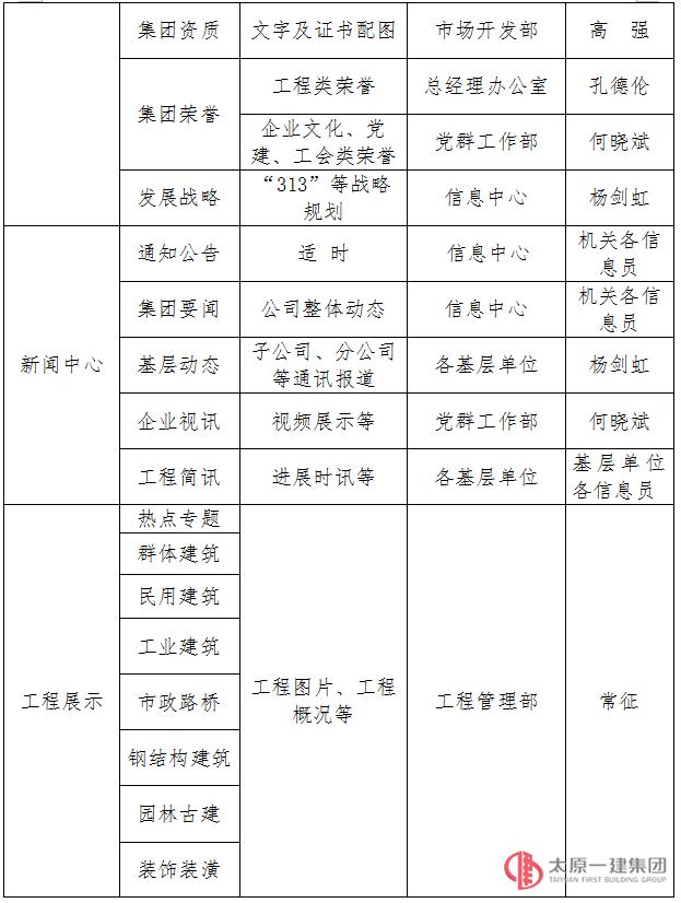 2018年是集團(tuán)公司的戰(zhàn)略創(chuàng)新年,為落實集團(tuán)公司《2018年企業(yè)工作安排》中的各項創(chuàng)新工作,信息中心根據(jù)集團(tuán)公司整體工作實際,對公司門戶網(wǎng)站進(jìn)行了全新改版,目前新版網(wǎng)站已經(jīng)全面上線,同時,為使新網(wǎng)站發(fā)揮出最大功效,更好地全面宣傳企業(yè),信息中心根據(jù)各基層單位和機關(guān)各部門在網(wǎng)站使用中的職責(zé)權(quán)限,按照《企業(yè)規(guī)章制度》中有關(guān)《網(wǎng)站管理辦法》的具體規(guī)定,對新版網(wǎng)站歸口權(quán)責(zé)進(jìn)行重新界定、統(tǒng)一規(guī)劃、責(zé)任到人,現(xiàn)制定具體方案,并要求各信息員每周不得少于一次信息動態(tài)更新,望各基層單位、各機關(guān)部門認(rèn)真遵照執(zhí)行,共同為宣傳企業(yè),提高企業(yè)的社會知名度踴躍發(fā)表高質(zhì)量、高水平的文章!
