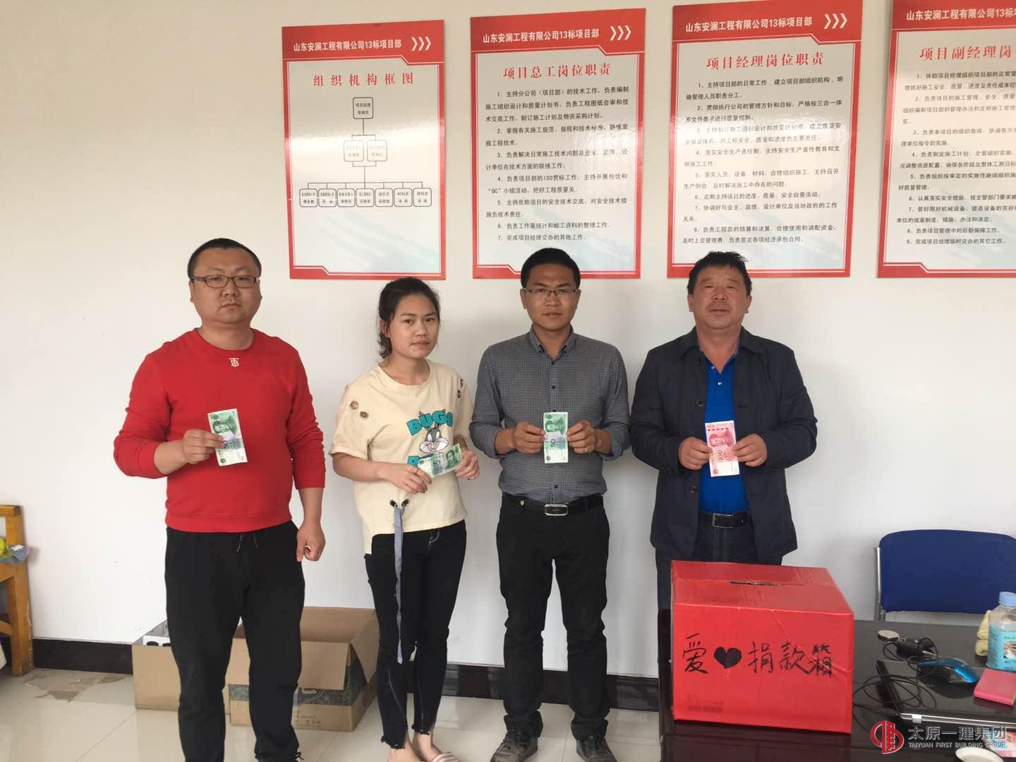 5月7日,在集團(tuán)公司第十二個“愛心日”來臨之際,六分公司全體職工在薛軍經(jīng)理的帶領(lǐng)下舉行了愛心捐款活動。由于分公司在建項目多,分散,不方便集中進(jìn)行,分公司工會采取以項目為單位的捐款方式,為項目部捐款提供方便,本次捐款,分公司在冊職工捐款率為100%,外聘職工也積極參加捐款,更深的了解“家”文化精神,更好的融入這個大家庭。