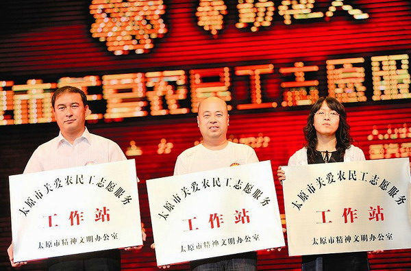 6月17日上午,由中央文明辦、人力資源和社會保障部、農(nóng)業(yè)部、國務(wù)院國資委、全國總工會、共青團中央、全國婦聯(lián)、全國工商聯(lián)8部委共同主辦的“全國關(guān)愛農(nóng)民工志愿服務(wù)活動” 太原市啟動儀式在太原市青年宮演藝中心隆重舉行。儀式上, 太原市精神文明辦公室向我集團公司等農(nóng)民工志愿服務(wù)工作成績突出的單位、網(wǎng)點頒發(fā)了“太原市關(guān)愛農(nóng)民工志愿服務(wù)” 工作站的牌匾。勞務(wù)中心主任李偉代表集團公司上臺接受了工作站牌。儀式由太原市副市長張政主持。
