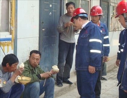 4月30日,集團公司高管層全體領導在董事長、總經(jīng)理王貴聰率領下頭戴安全帽,身著企業(yè)工裝來到九分公司承建的汾東文體中心工地,對節(jié)日期間堅守崗位辛勤工作的全體作業(yè)人員、職工進行了看望和現(xiàn)場調(diào)研。進入現(xiàn)場后領導們直奔作業(yè)區(qū),并步入正在施工的樓上對工程質(zhì)量、安全防護措施、現(xiàn)場文明施工情況進行了細致檢查,然后領導們又到生活區(qū)對作業(yè)人員的食宿情況進行了檢查,王總經(jīng)理與正在吃午飯的工人們進行了親切交談和情況調(diào)研。到辦公區(qū)后,項目經(jīng)理路立科和分公司經(jīng)理張岐泰先后分別做了情況匯報,領導們聽取匯報后,王總經(jīng)理作了熱情洋溢的重要講話,首先,認為從施工現(xiàn)場建設到克服施工工藝的難度,體現(xiàn)了九分公司的實力和能力,并對九分公司的整體工作情況表示滿意,同時提出了三點要求和希望:1、保持持續(xù)、健康、積極的發(fā)展態(tài)勢,通過努力進一步增強實力,在經(jīng)營的項目上要選擇優(yōu)良的、有形象代表性的項目,走自建項目發(fā)展的道路。2、抓住工程裝修階段的關鍵,一是施工標準不能降低,二是確保安全生產(chǎn)。3、堅持干、算結(jié)合,既要干好、也要算好。努力降低成本,提高效益,通過努力要干出九分公司的特色來。中午領導們與項目部管理人員、分公司領導及作業(yè)隊負責人在項目部食堂共進午餐,對大家以示節(jié)日的祝賀和深切的慰問,極大的鼓舞了職工士氣。
